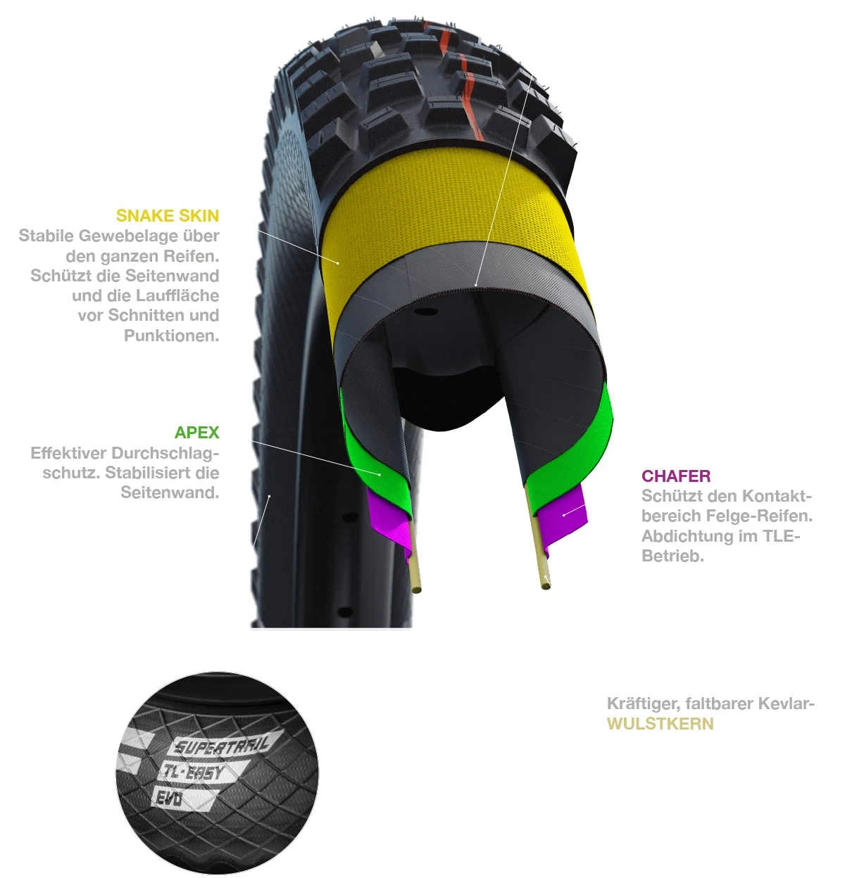 Der neue Standard für unsere MTB-Evo Reifen. Ein neues monofiles Seitengewebe bringt gleich drei Vorteile gegenüber dem bisherigen SnakeSkin-Gewebe: Noch bessere Schnittsicherheit, erhöhte Durchschlagsicherheit und vor allem ermöglicht es eine extrem leichte Tubeless Konversion. Der Einsatz von Dichtflüssigkeit ist erforderlich, aber die Montage ist ansonsten genauso leicht wie bei echten Tubeless-Reifen. Lange Konversionsprozesse mit intensivem Schütteln und häufigem Nachpumpen gibt es mit Tubeless Easy nicht mehr. Tubeless Easy ersetzt sowohl die bisherigen Tubeless Reifen als auch die Tubeless Ready Ausführung. Natürlich kann man die Reifen auch weiterhin ganz normal mit einem Schlauch montieren.